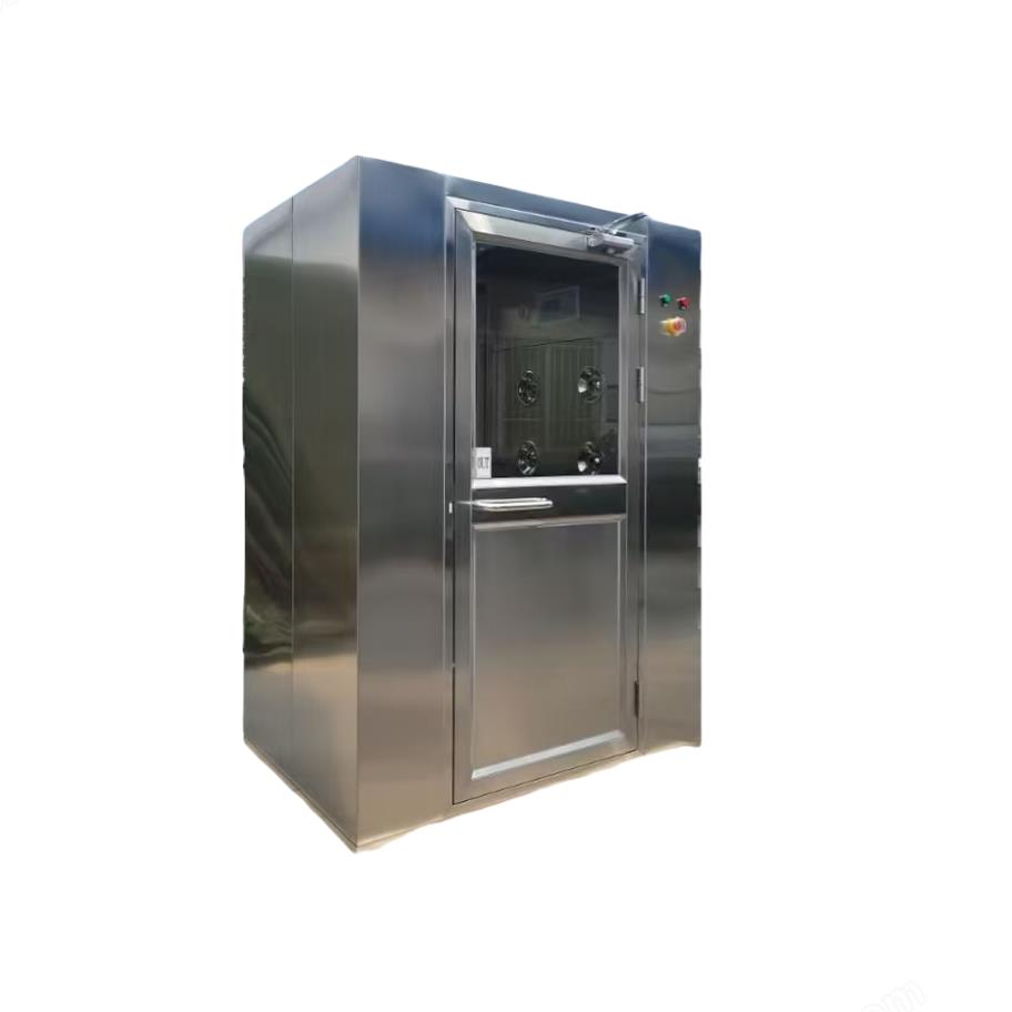 作用: 风淋室是人员进入洁净室无尘车间所*的净化设备,通用性强,可与所有的洁净室和洁净厂房配套使用,工作人员进入车间时,必须通过此设备,用强劲洁净的空气,由可旋转喷嘴从各个方向喷射至人身上,有效而迅速清除去附着在衣服上的灰尘、头发、发屑等杂物,它可以减少人进出洁净室所带来的污染问题。风淋室的两道门电子互锁,可以兼起气闸室的作用,阻止外界污染和未被净化的空气进入洁净区域。杜绝工作人员将头发,灰尘等带入车间,达到工作场地严格的无尘净化标准,生产出高质量的产品